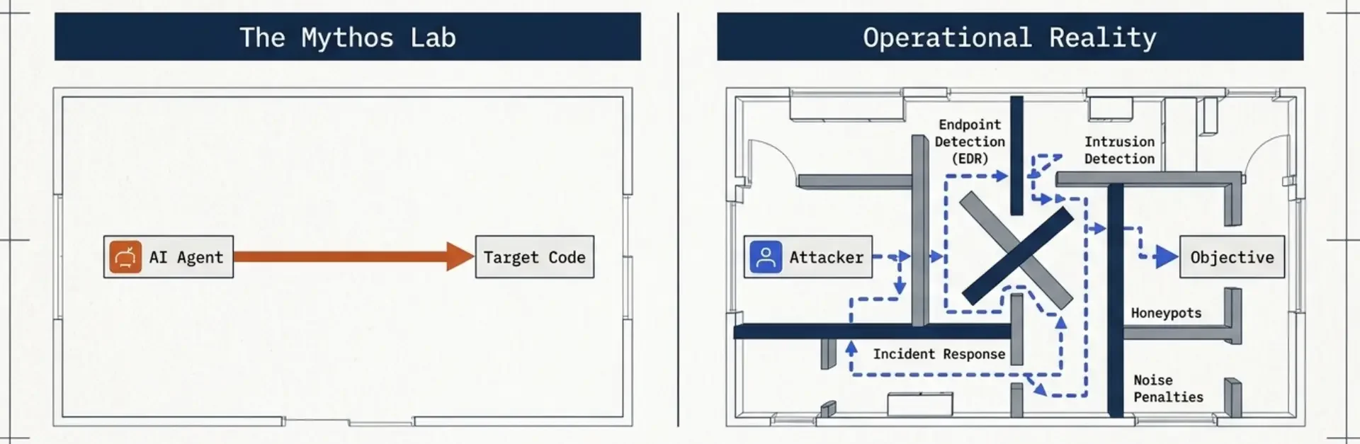 AI ≠ real penetration testing. Mythos showed strong code analysis and chaining of known techniques, but it operated in a lab with no defenses. That’s closer to automated research than adversary emulation against real-world controls.