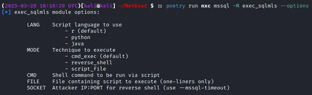 This module accepts parameters via the standard Netexec module options mechanism to specify the script language to use and the operation mode. Each operation mode requires another parameter – for example, a local IP and port must be passed via SOCKET when using MODE=reverse_shell.